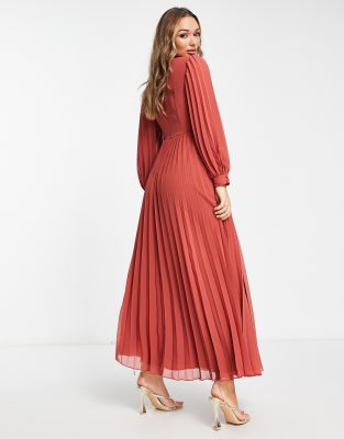 Asos Design Hochgeschlossenes Plissiertes Maxikleid In Rost Mit Stickerei Asos